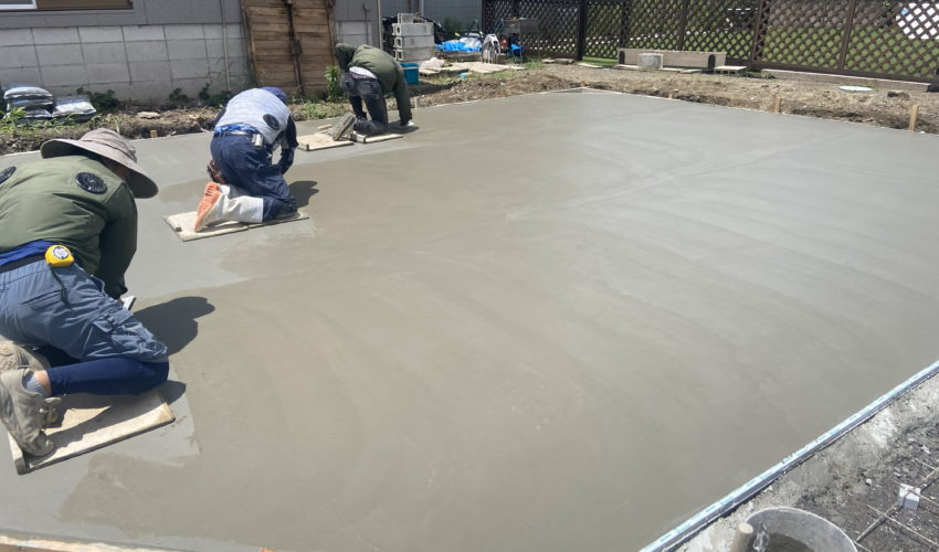 新築工事完了後、広さ約145㎡のお庭部分にコンクリート打設工事を行いました。